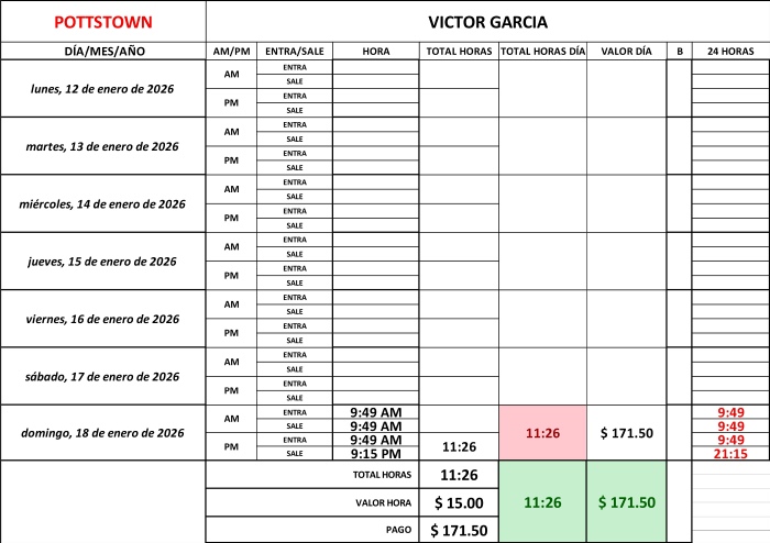 PAYROLL POTTSTOWN ADRIANA FOLGAR AMOS VICENTE ASTRID SACACH CARLOS OROZCO EMANUEL US FERNANDO CRUZ JOSUE VASQUEZ LEONEL ALARCON VICTOR GARCIA ZANDRA MUNZON ZENAIDA PEREZ RESUMEN